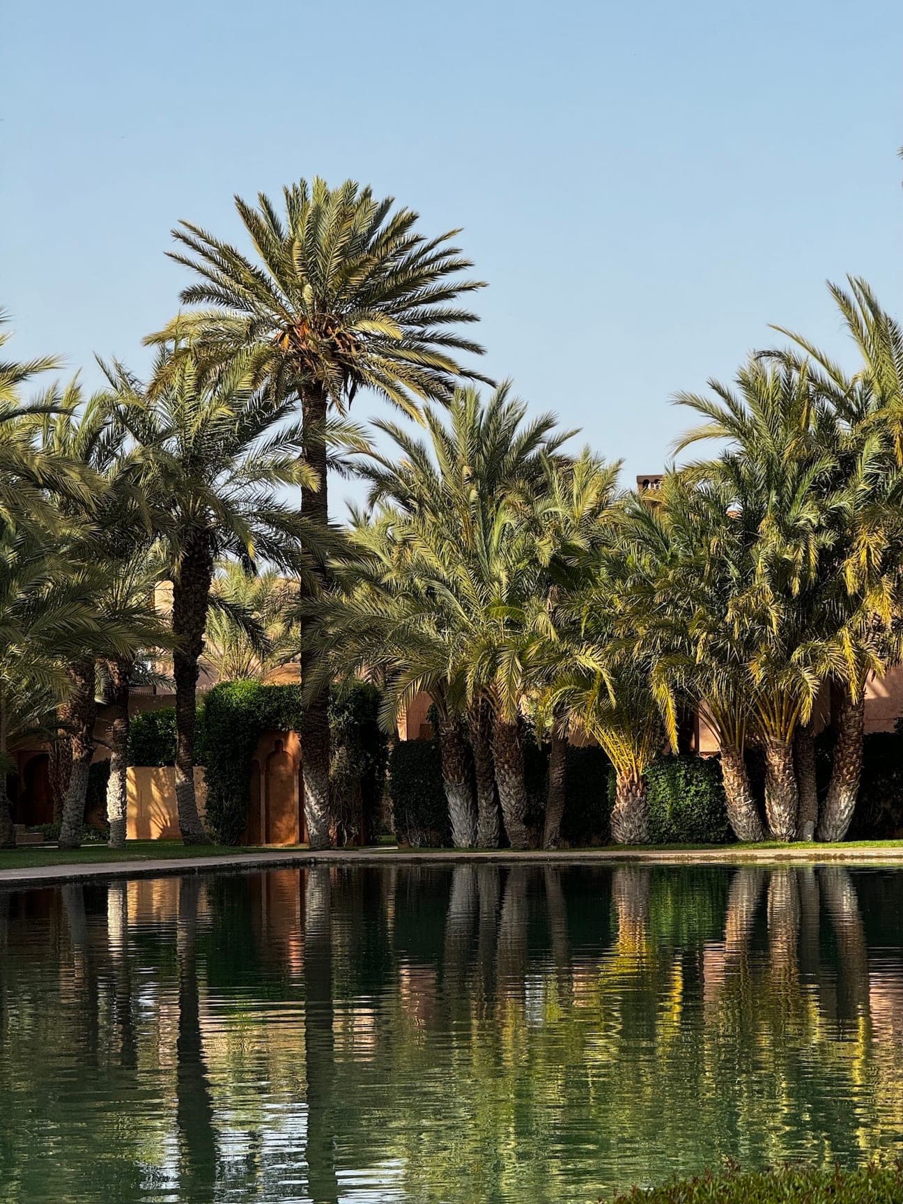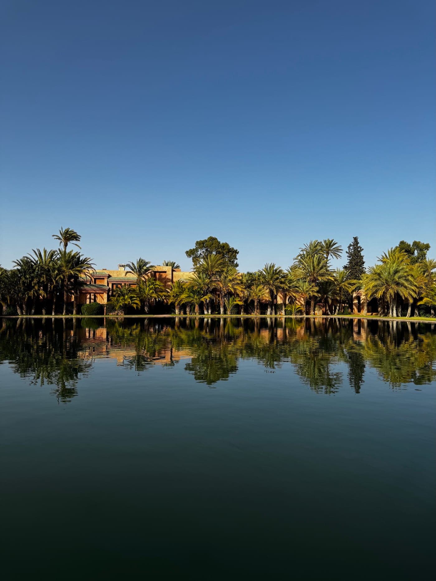 The Palm Grove of Marrakech extends southward from the city in thick clusters of green, a landscape that serves as visual buffer between the dense Medina and the open desert. Amanjena occupies fifteen acres within this zone, a position that places the resort at the threshold between two distinct environments, able to offer both the cultural proximity of the city and the spatial generosity of the palm-forested periphery.