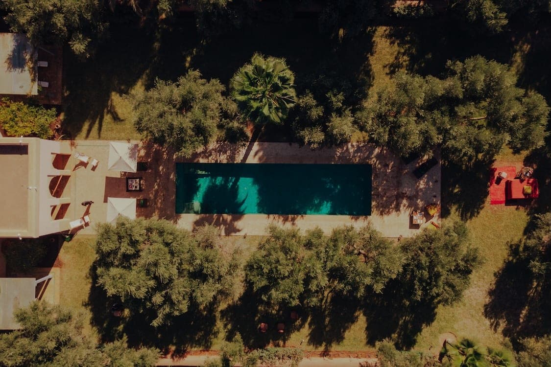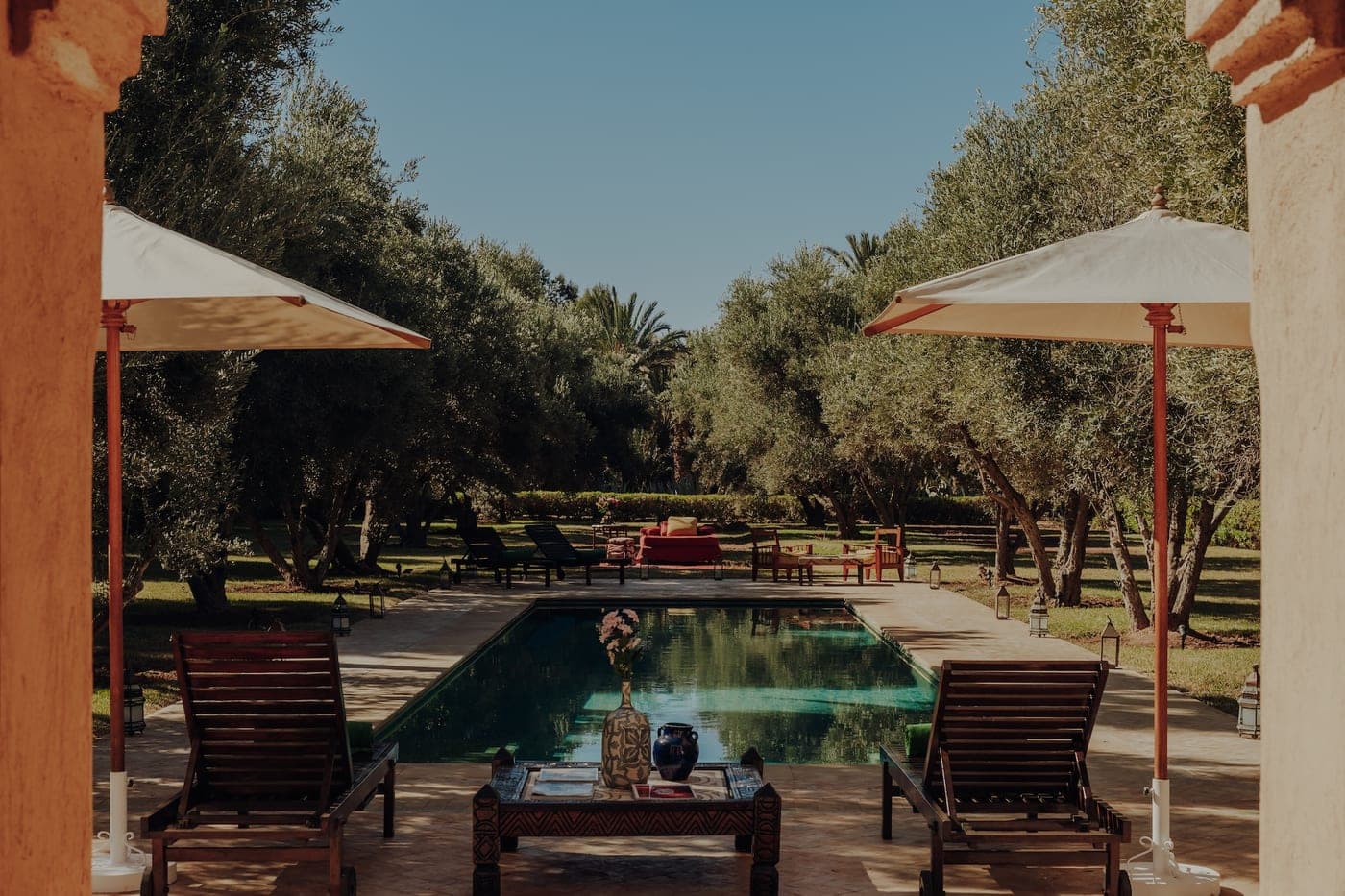 The three hectares carry olive trees that predate the house, alongside date palms, jasmine, and the quieter vegetation that fills in the spaces between them. Peacocks move through the grounds with that characteristic sense of occupying space without announcing it. The heated pool extends over the grove, offering the clean geometry of a reflecting surface against the organic irregularity of the orchard below.