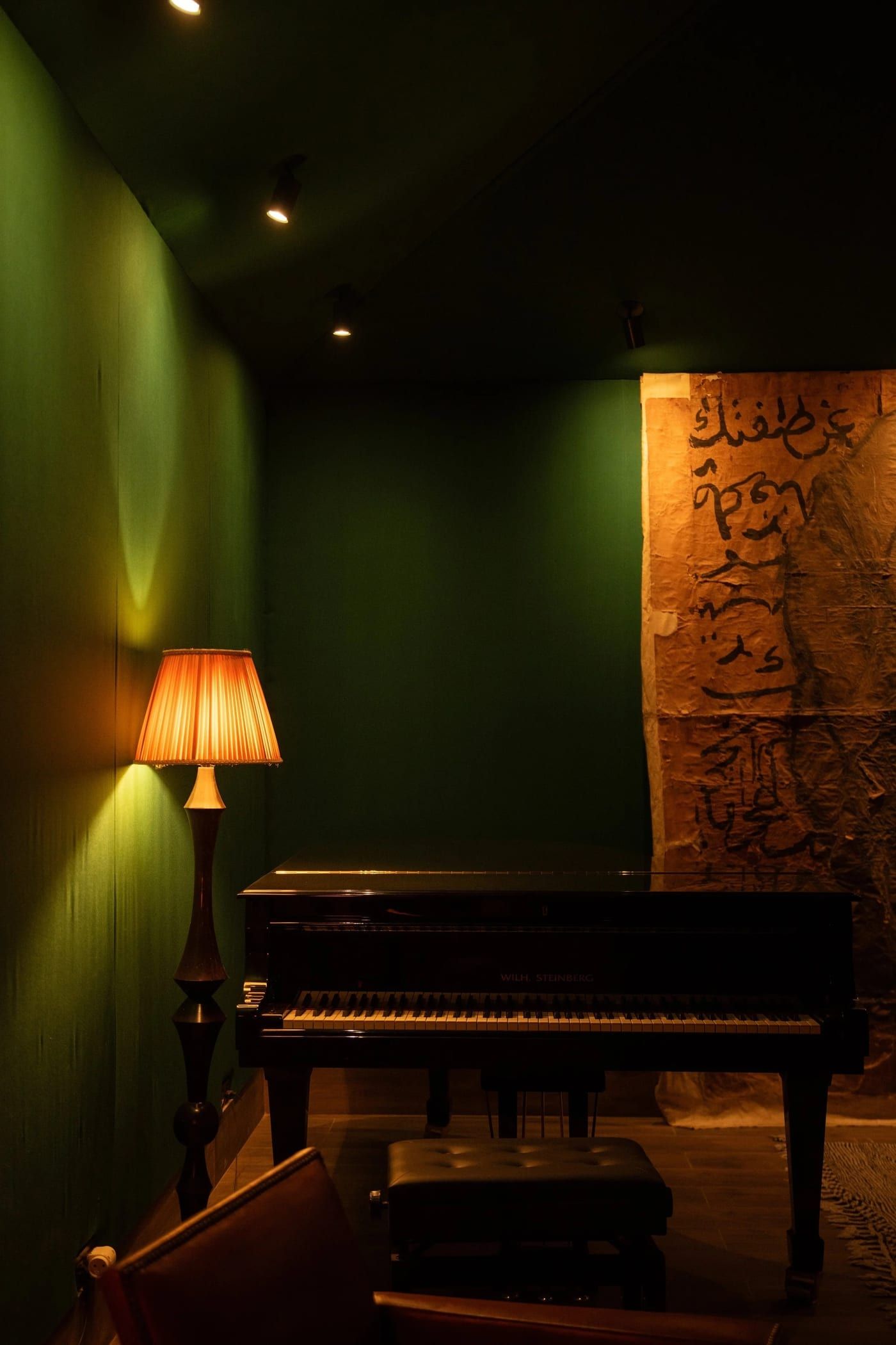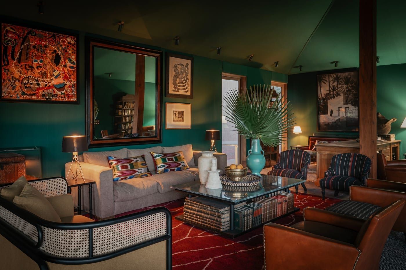 The layering is deliberate and dense, but nothing sits as decoration for its own sake. The jute textile applied to the wall in the Explorer, the mashrabiya-inspired screen with Amazigh patterns in the bathroom, the lamps modelled on those found in 1940s scientists' studies: each element traces a line back to a specific place and time. The overall effect is less that of a themed room and more that of an interior with a private logic, assembled by someone who has actually travelled the route.