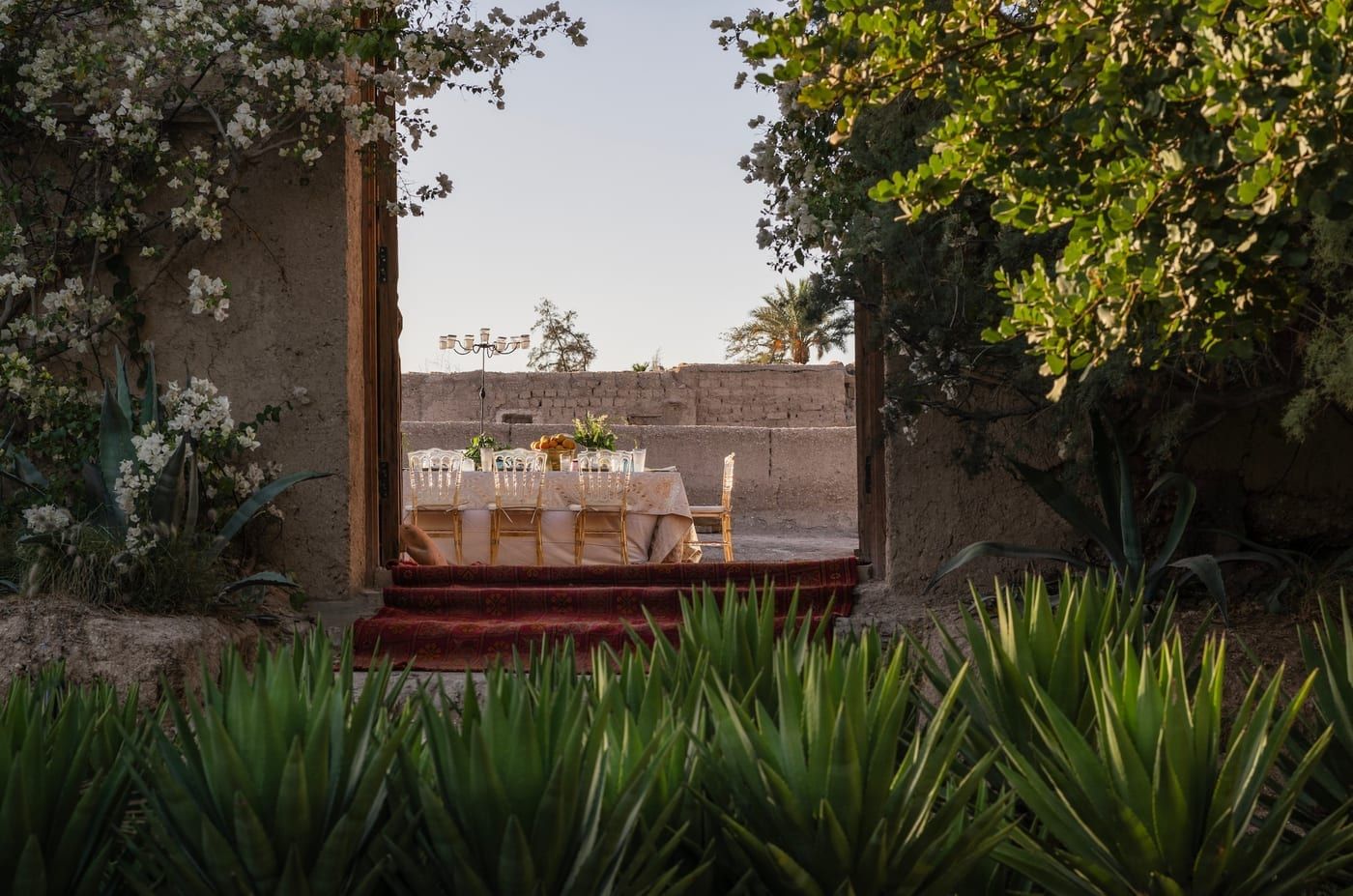The gate is old, unhurried. What's beyond it doesn't announce itself. A path curves through palms and undergrowth grown over more than two decades of patient cultivation, over 700 plant varieties, a garden dense enough that your first instinct is to slow down, not to scan for amenities. Then the vegetation opens, and the tents appear: low, composed, standing at the edge where cultivated ground gives way to sandy horizon: This is Jnane Karwan.