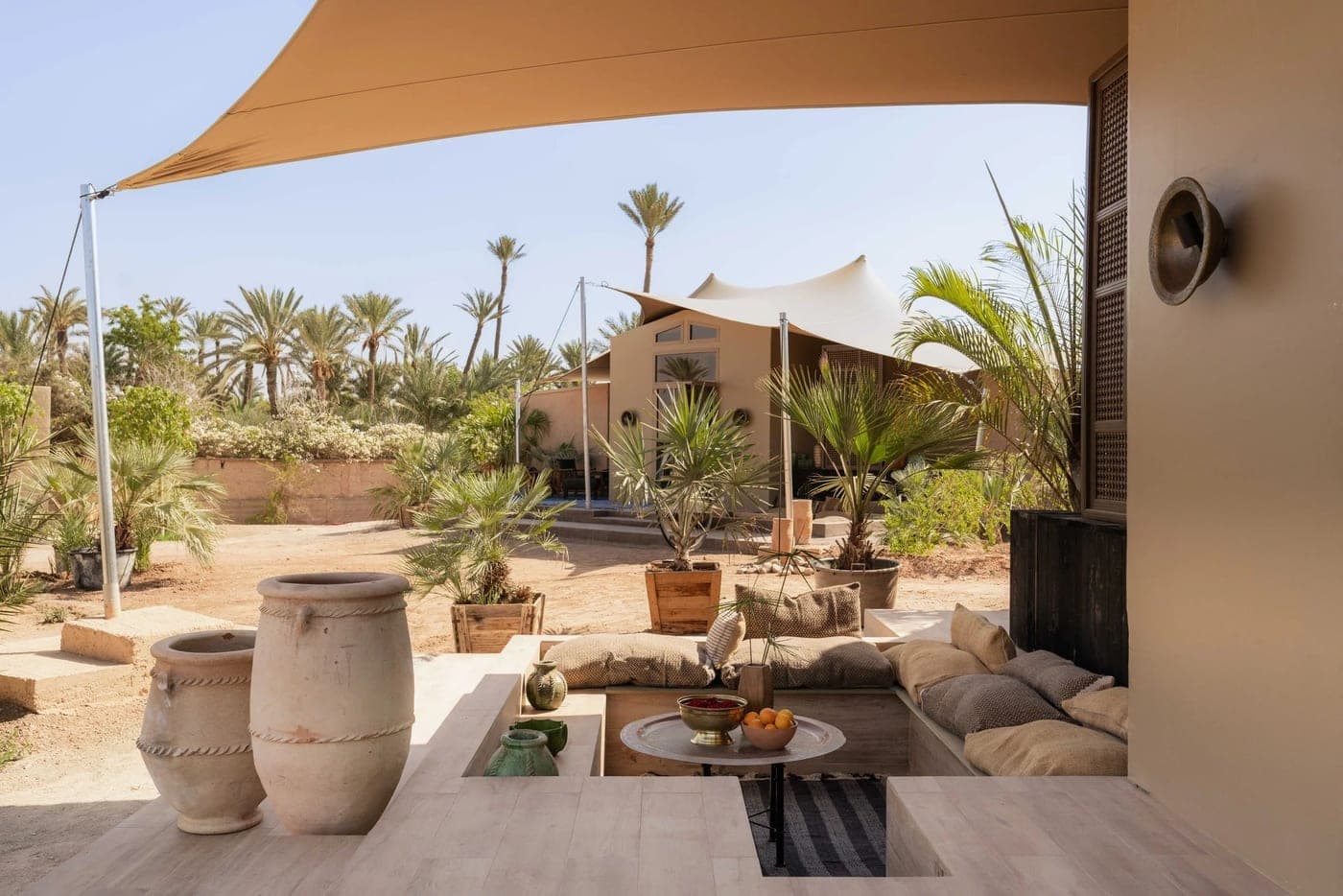At the edge of Jnane Tamsna's nine-acre estate, a small camp sits between two landscapes that, in Marrakech, rarely touch: the density of an oasis garden and the open quiet of desert land.