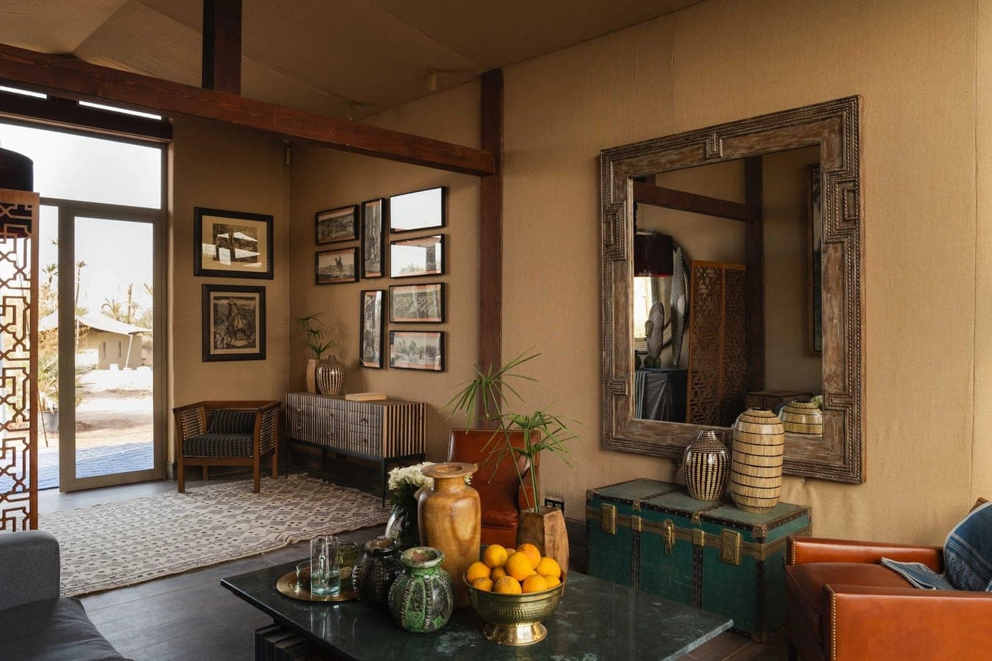 The Timbuktu Tent turns toward West Africa and the Saharan trade routes. The Explorer Suite, the larger of the two Safari Suites, documents the continent through another lens: old photographs from the Sahara and the Sahel line the walls, chosen for their specificity rather than their aesthetic appeal. The fabrics reach across the continent: textiles by Aïssa Dione from Senegal, a bedspread from India with a Suzani-inspired print, a bedhead textile from Togo, a weave from Sierra Leone made by artisans working in Senegal. A painting by Philippe Deltour, chosen for its resonance with the surrounding palm grove, hangs in the salon alongside books from Meryanne's family collection, old leather bindings, large-format, heavy with history.