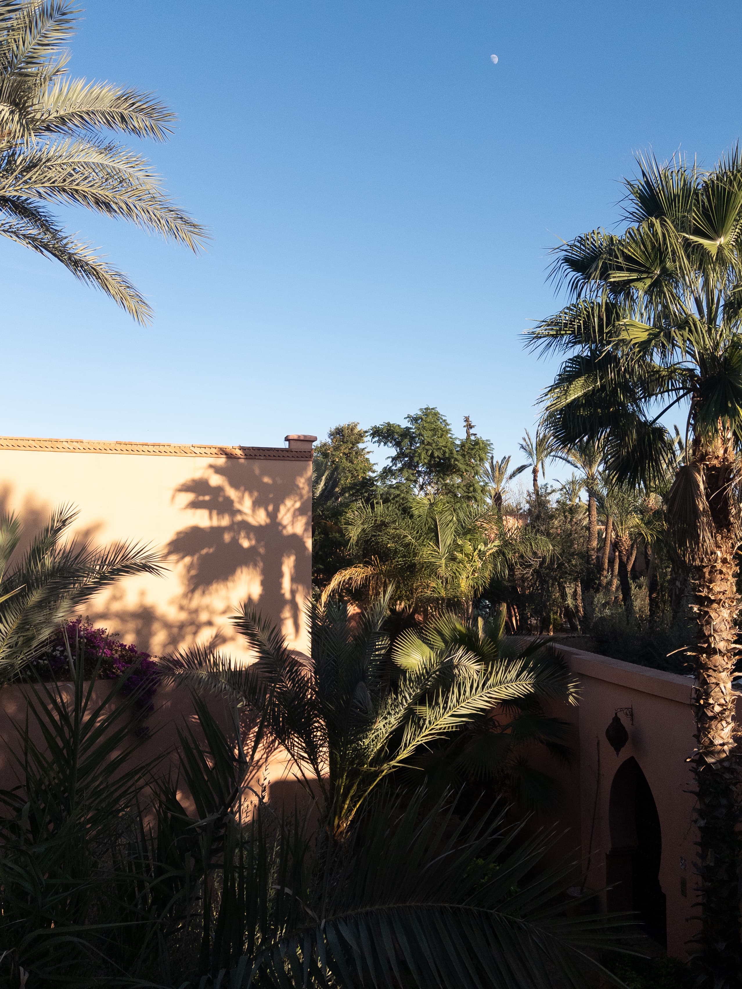 The landscape changes character through the seasons in ways that matter to how it is used. In winter, the grove holds a clarity that the summer does not: cold nights sharpening the days, the low light catching the upper fronds in a way that the overhead sun of July erases. In summer, the shade of the palms earns its meaning differently. It is not decorative but necessary, the functional reason that the Palmeraie exists as a destination at all when the city bakes. The resorts manage this seasonal rhythm deliberately; guests who understand it can calibrate their time in the grove accordingly. In practice, this means organizing the day differently by month. A December morning in the grove, garden breakfast with the sun still low and the air cool, uses the landscape as the medina cannot. A July afternoon reverses the sequence: the shade earns its meaning only when the city outside is at its most demanding.