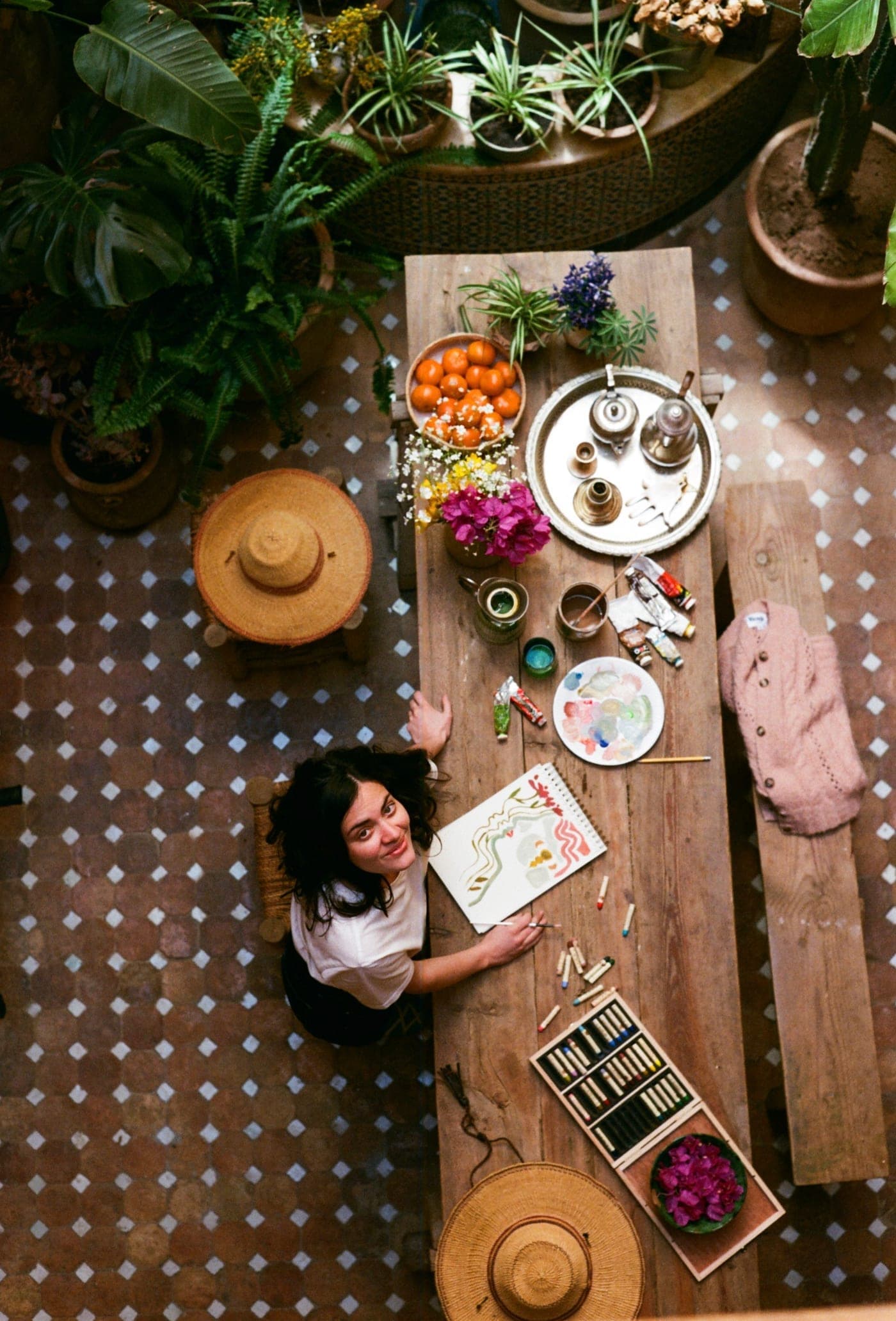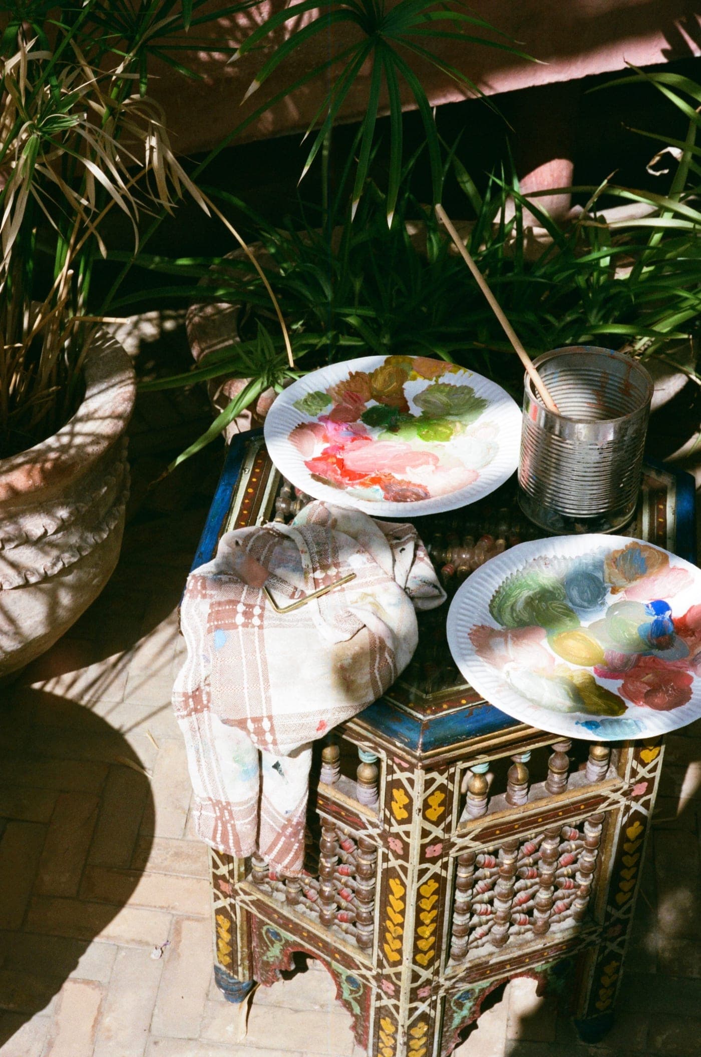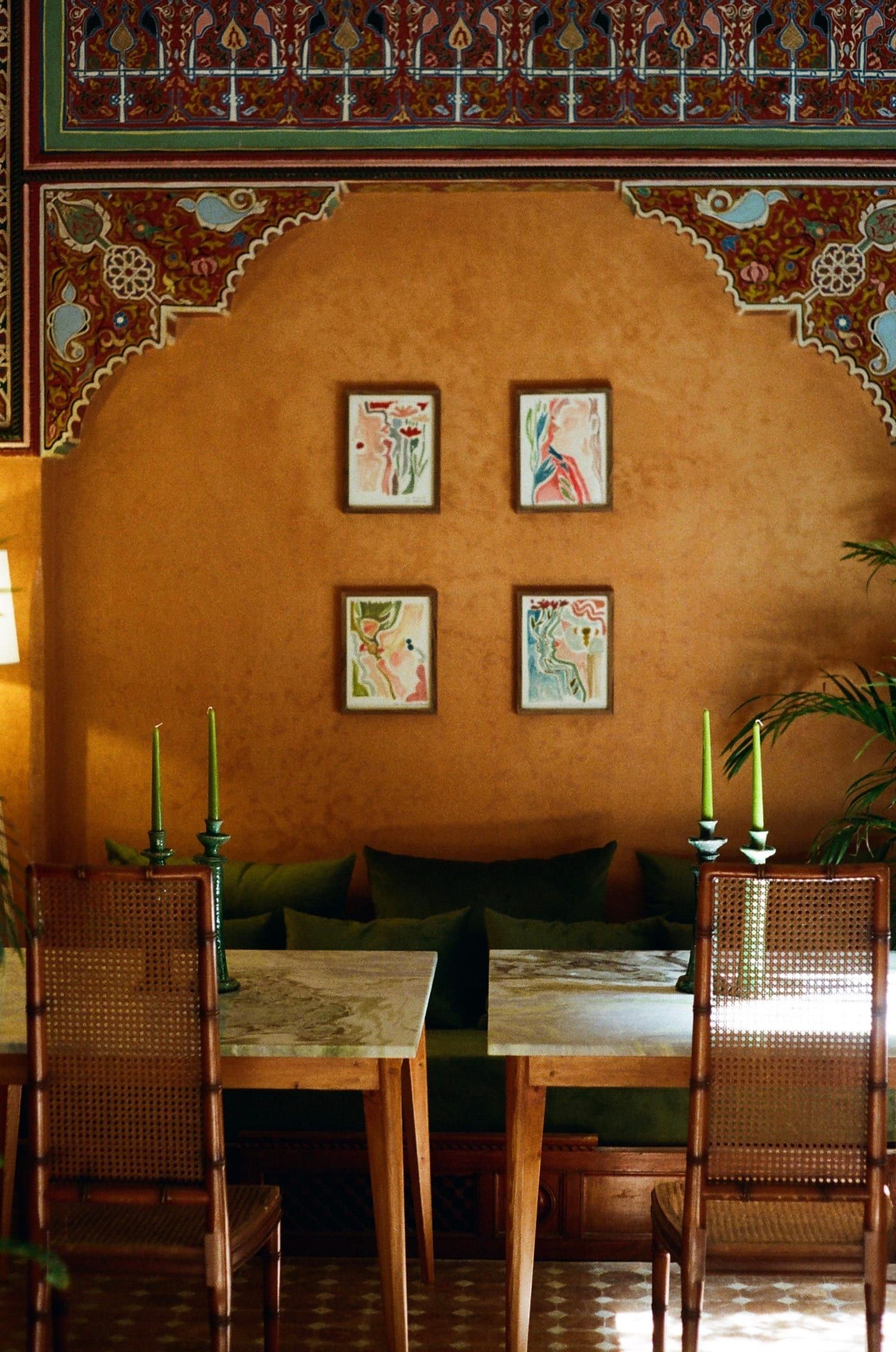 Since opening, the riad has hosted an artist residency programme that welcomes painters, illustrators, photographers, musicians, and other creatives to live and work within the property. The residency is entirely based on sharing: artists receive the opportunity to explore a different culture, experiment with materials, and collaborate with local artisans. Each participating artist donates a work to the riad's growing collection, which remains on display for guests, layering new narratives onto the historic surfaces with each cycle of residence.