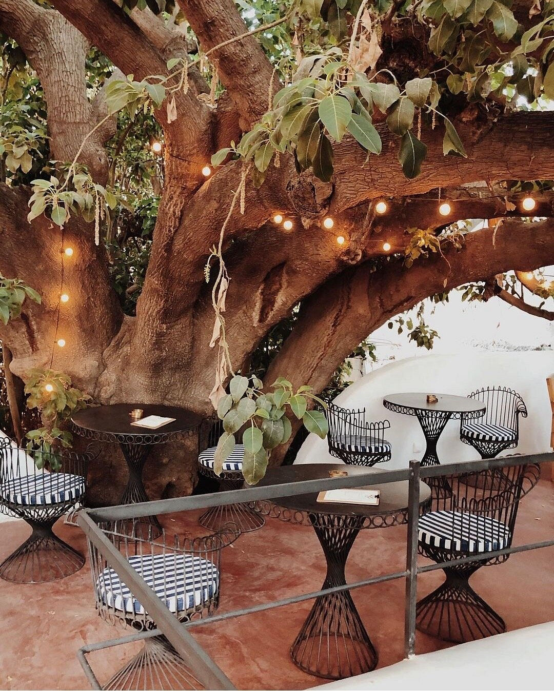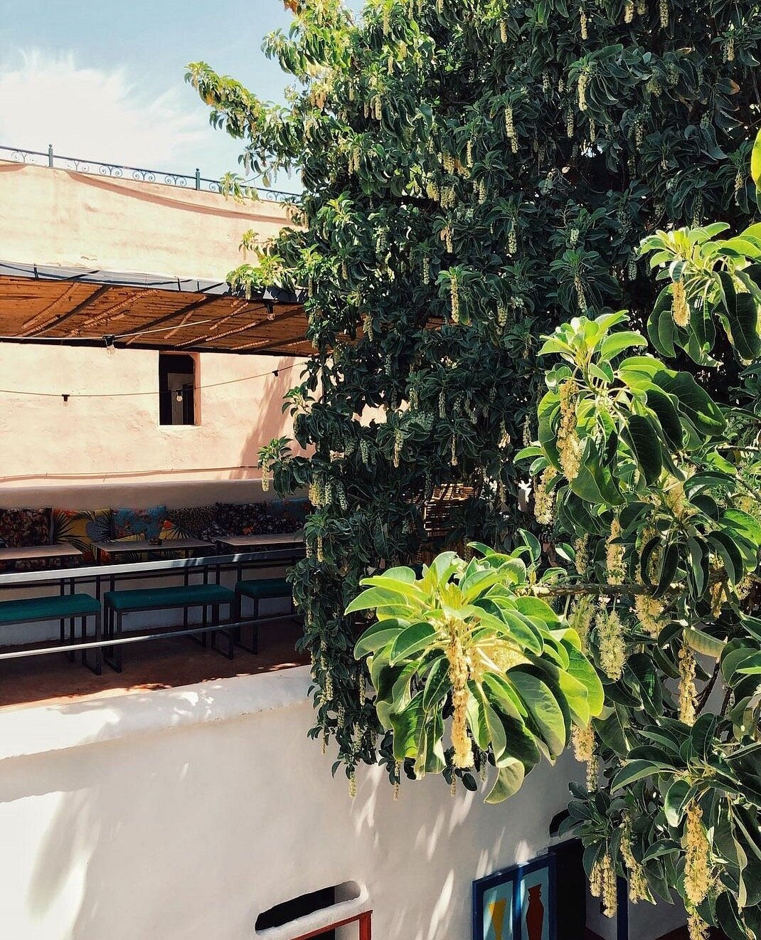 The restaurant's multi-level space includes a ground-floor boutique selling clothes and accessories, a cozy indoor dining area, and a charming rooftop terrace shaded by a large walnut tree. The atmosphere is laid-back and inviting, making it a perfect spot to escape the hustle and bustle of the Medina.