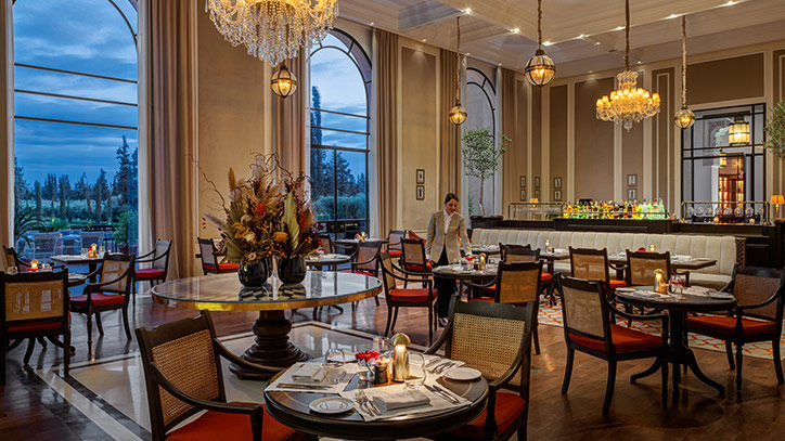 Guests can dine indoors with a view of the gourmet show kitchen or choose the al fresco terrace for picturesque views of the Atlas Mountains. Tamimt also boasts a lounge area, perfect for enjoying an aperitif or after-dinner drink. The elegant decor, complete with frescoes and grand chandeliers, adds to the sophisticated dining experience.
