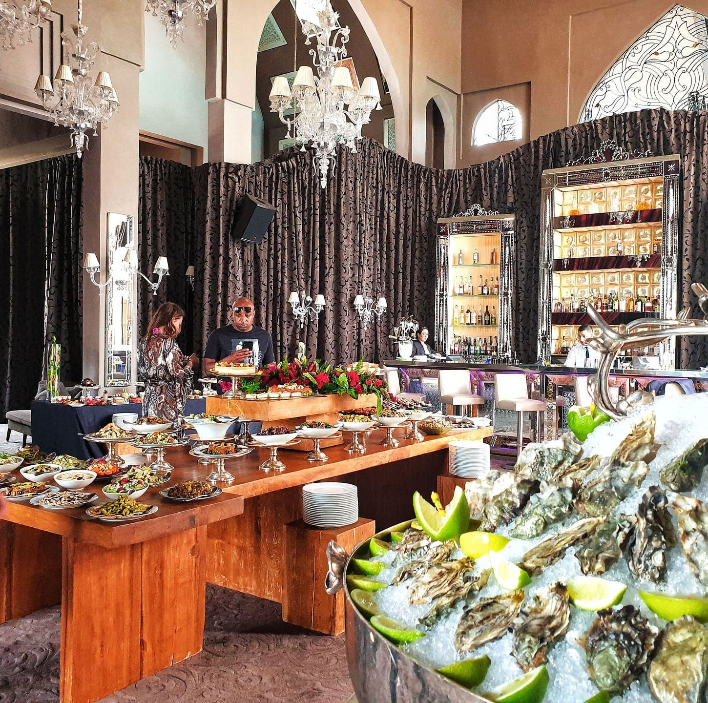 The Sunday Brunch at Palais Namaskar is a luxurious and relaxing affair, taking place in the tranquil gardens of this stunning resort. Guests can enjoy a lavish buffet featuring a diverse array of Mediterranean dishes, Moroccan specialties, fresh seafood, grilled meats, salads, cheeses, and an assortment of decadent desserts. Live music adds to the delightful ambiance as guests unwind by the pool or stroll through the lush gardens. It's a perfect way to spend a leisurely Sunday afternoon in Marrakech, indulging in delicious food and soaking up the serene atmosphere.