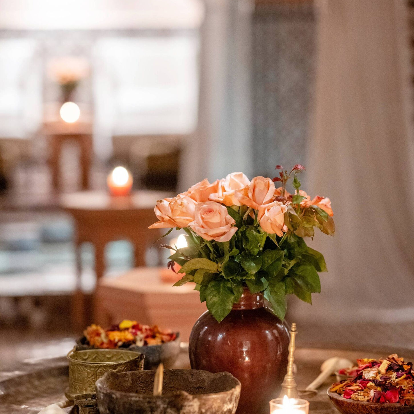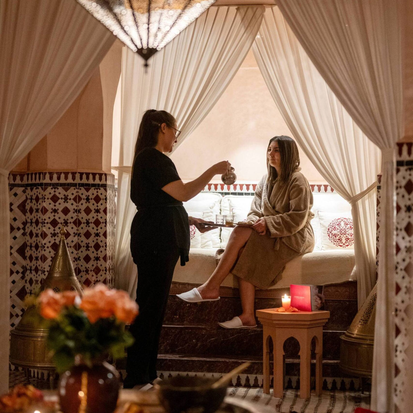 Almaha Marrakech and Spa, located within the luxurious Almaha hotel, is a haven of well-being offering a unique experience in the heart of Marrakech. Immerse yourself in an atmosphere of refined elegance and let yourself be pampered by personalized spa treatments inspired by ancient Moroccan traditions. The Almaha Marrakech and Spa wellness center offers a wide range of treatments to meet every need: Traditional Hammam: Experience the authentic Moroccan hammam, a purifying ritual that regenerates body and mind. Massages: Choose from a variety of relaxing, toning or therapeutic massages, performed by expert hands. Facials: Brighten your face with personalized treatments that use products based on argan oil, renowned for its nourishing and regenerating properties. Hair removal: Keep your skin flawless with professional and delicate hair removal treatments. Almaha Marrakech and Spa uses exclusively pure argan oil-based products, a precious ingredient with antioxidant and nourishing properties. Argan oil, known as "liquid gold of Morocco", gives the skin deep hydration and a luminous and healthy appearance. Almaha Marrakech and Spa stands out for its refined environment and attention to detail. The wellness center has a panoramic terrace with a view of the city, a traditional hammam and an artistic lounge where you can relax before or after treatments.